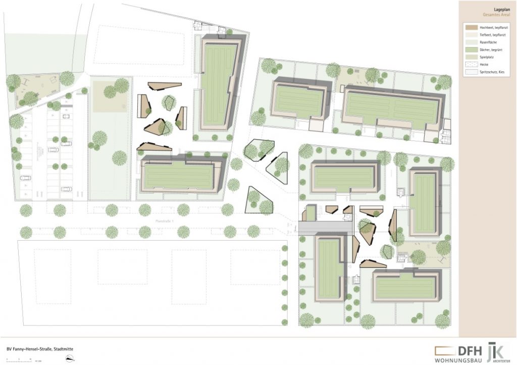 Die Gebäude gruppieren sich auf drei Baufelder zu einem lebendigen Quartier mit kurzen Wegen und Raum für Begegnung. Großzügige Außenbereiche, Spiel- und Aufenthaltsflächen, sichere Fahrradstellplätze sowie Tiefgaragen tragen zu einer hohen Wohnqualität bei. Begrünte Dächer mit Photovoltaikanlagen und die Umsetzung im KfW-Effizienzhausstandard 40 mit QNG-Siegel unterstreichen den Anspruch an Nachhaltigkeit und verantwortungsvolles Bauen.