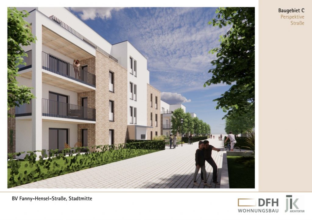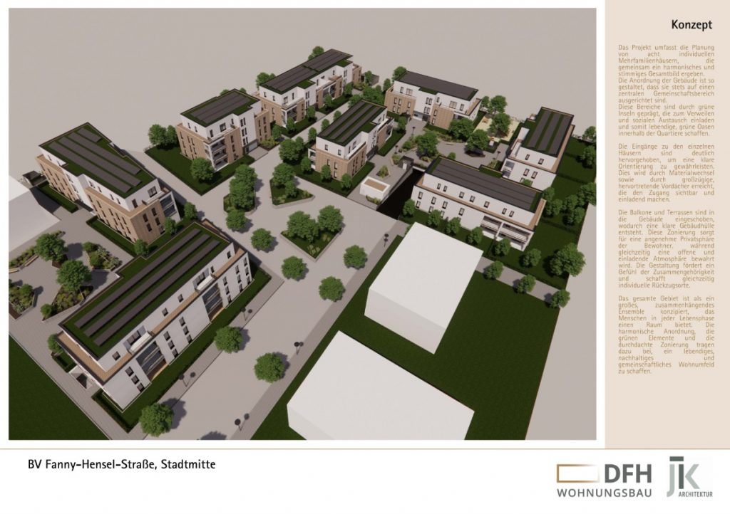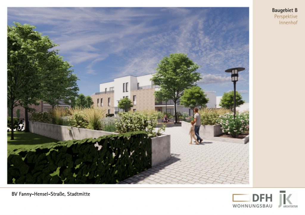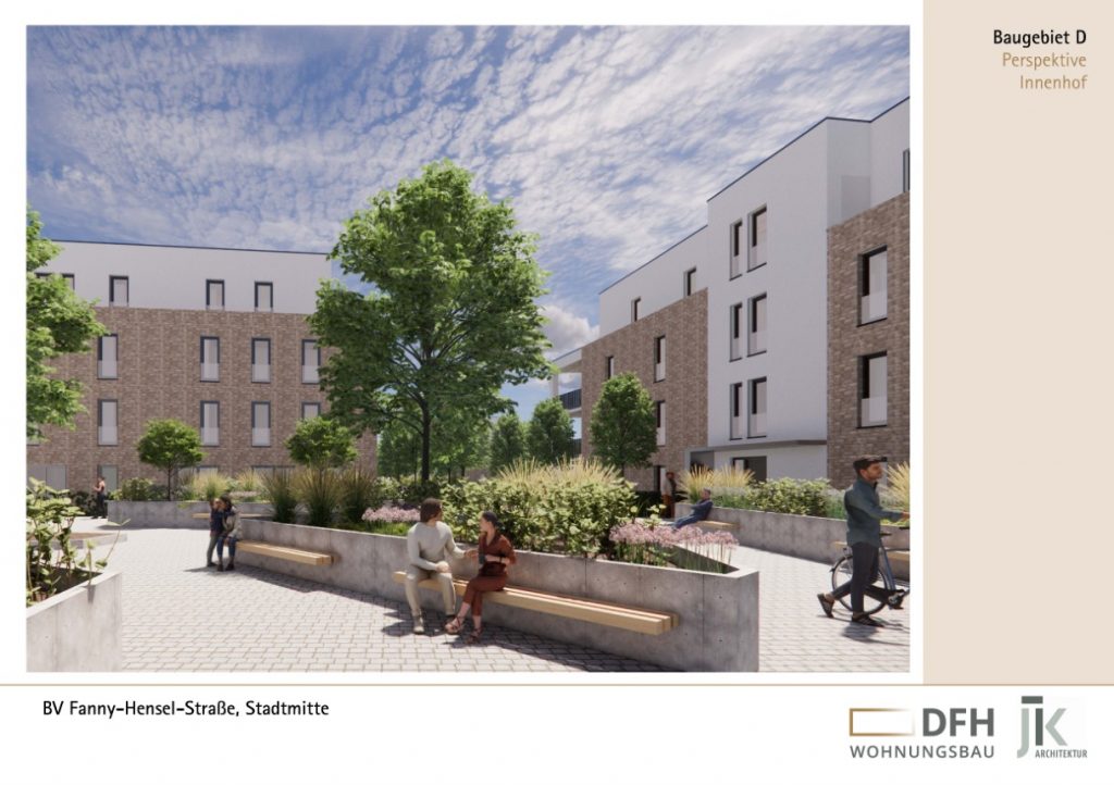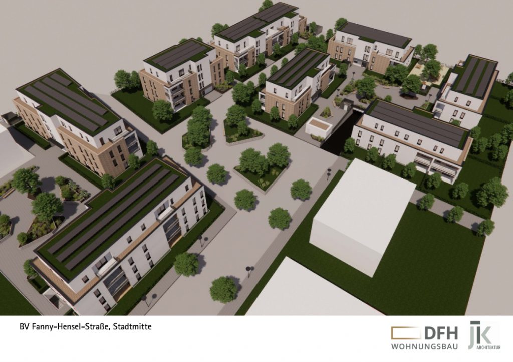 Insgesamt werden 86 Wohneinheiten mit Grundrissen von rund 45 m² bis 110 m² geplant, ein Großteil davon förderfähig nach Wohnraumförderung des Landes NRW.
